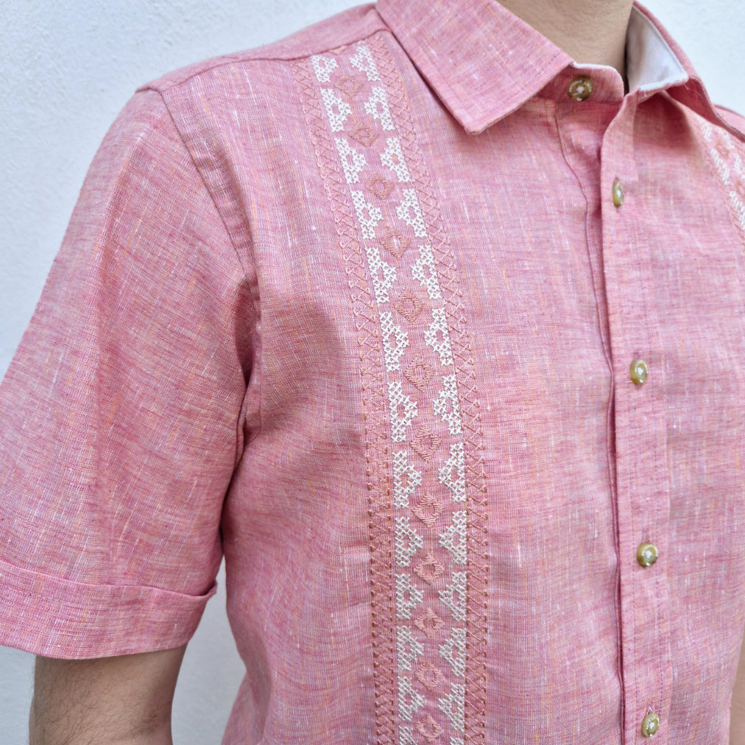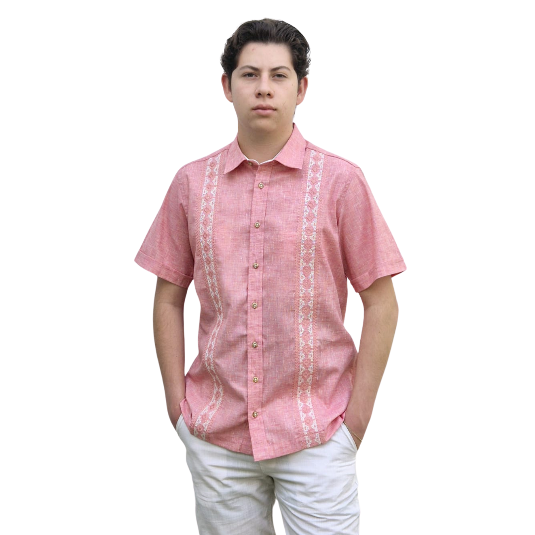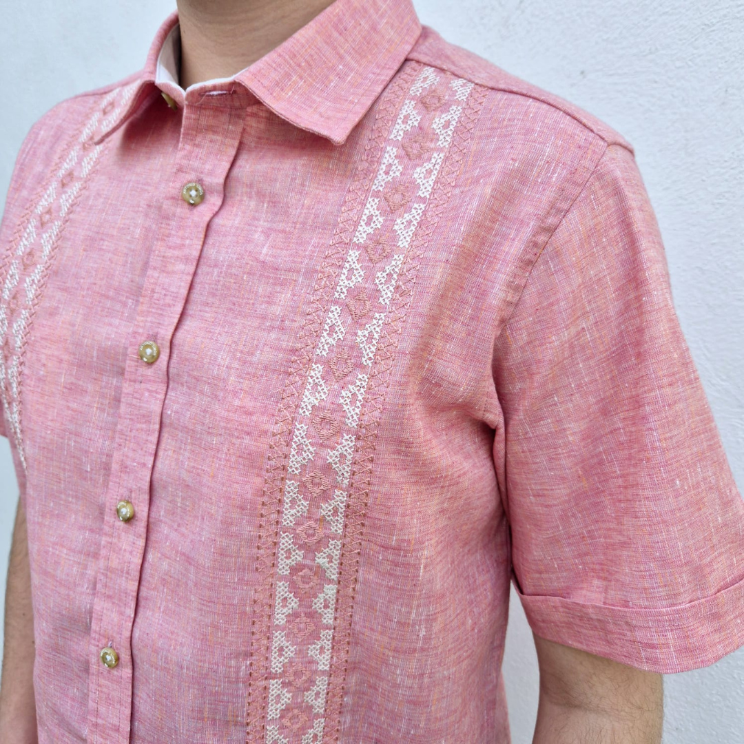 | DESCRIPCIÓN | Guayabera Antonio Limon para caballero coral, manga corta, cuello normal, bordado en toques de coral y hueso, tela 50%lino 50%algodon, prelavada. | ||||